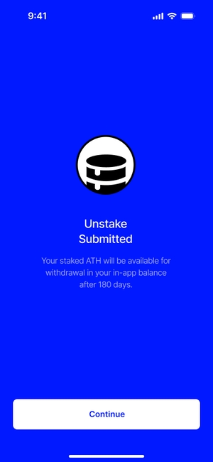 Unstake Confirmation: After unstaking, you'll receive a confirmation message that the ATH will be returned to your account after 180 days.