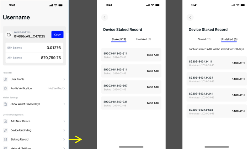 * **Hồ sơ đặt cọc và hủy đặt cọc:** Giờ đây, người dùng có thể xem hồ sơ đặt cọc và hủy đặt cọc của họ trực tiếp từ trang cài đặt. Tính năng này cung cấp thông tin chi tiết về cả ATH đã đặt cọc và chưa đặt cọc, bao gồm cả thời gian khóa cho các token chưa được đặt cọc.