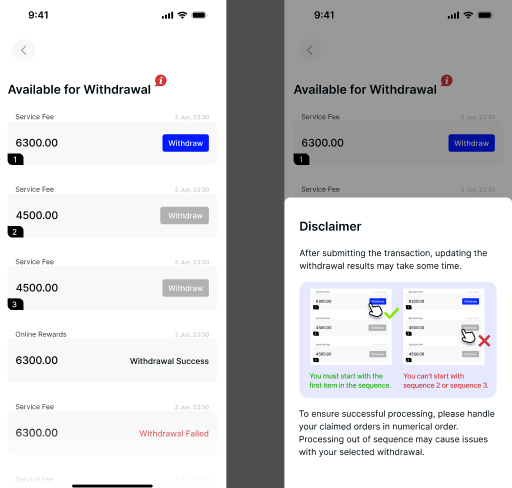 * **Thông báo trình tự rút tiền:** Một tuyên bố từ chối trách nhiệm và hướng dẫn trực quan mới đã được thêm vào màn hình rút tiền để nhấn mạnh tầm quan trọng của việc xử lý các đơn đặt hàng đã yêu cầu của bạn theo thứ tự số. Điều này là để đảm bảo xử lý thành công và tránh các vấn đề với việc rút tiền của bạn.