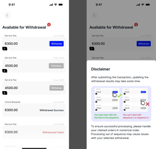 Thông báo trình tự rút tiền: Một tuyên bố từ chối trách nhiệm và hướng dẫn trực quan mới đã được thêm vào màn hình rút tiền để nhấn mạnh tầm quan trọng của việc xử lý các đơn đặt hàng đã yêu cầu của bạn theo thứ tự số. Điều này là để đảm bảo xử lý thành công và tránh các vấn đề với việc rút tiền của bạn.
