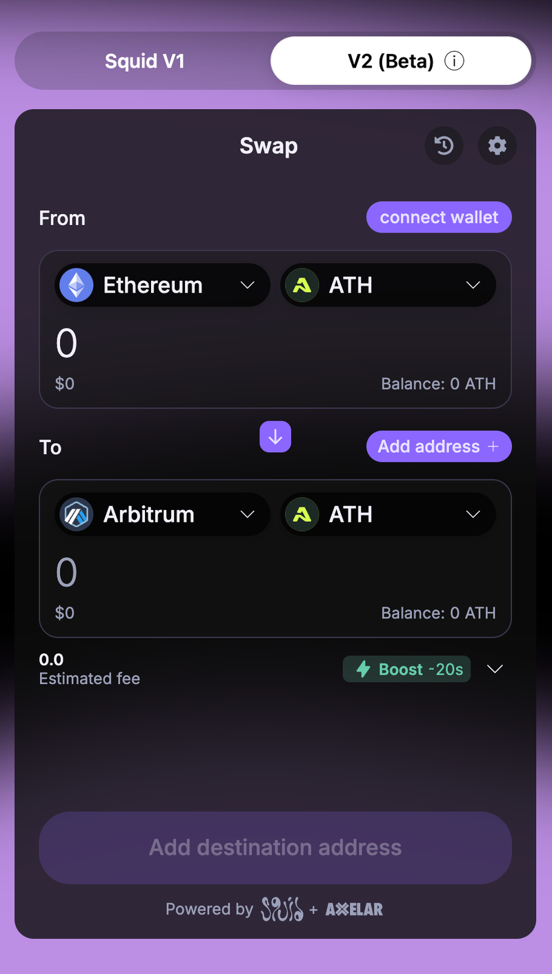 * **Chỉ sử dụng** [**Squid Router**](https://v2.app.squidrouter.com/?chains=42161%2C1\&amp;tokens=0xc87B37a581ec3257B734886d9d3a581F5A9d056c%2C0xbe0Ed4138121EcFC5c0E56B40517da27E6c5226B) **để bắc cầu ATH giữa Ethereum và Arbitrum.**