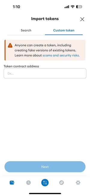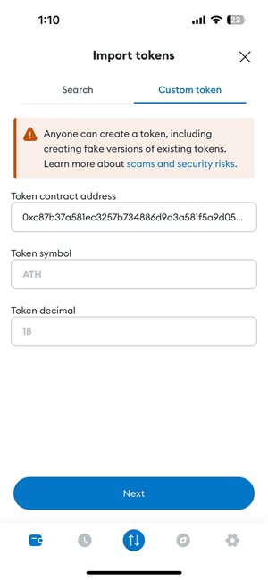 Thêm token: Nhấp vào nút "Thêm token tùy chỉnh" để thêm token ATH vào ví MetaMask của bạn.
