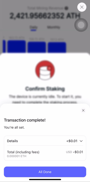 Hoàn tất Staking: Bạn sẽ thấy thông báo trên bảng điều khiển chính để hoàn thành staking. Ứng dụng sẽ giải thích số lượng ATH cần thiết dựa trên thiết bị và điều kiện mạng của bạn.