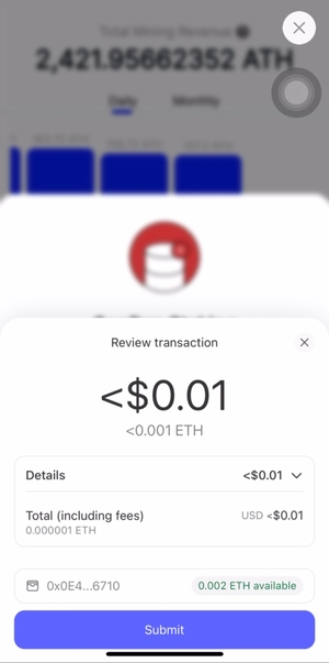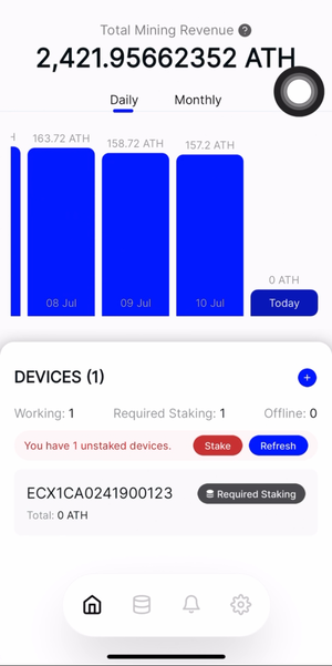 Xác định số tiền stake: Ứng dụng sẽ hướng dẫn bạn xác định số lượng ATH cần thiết dựa trên cấp độ thiết bị của bạn và điều kiện mạng hiện tại. Thông tin này sẽ được hiển thị trên bảng điều khiển chính, cho thấy tổng doanh thu khai thác, các thiết bị đã kết nối và số lượng ATH cần staking.